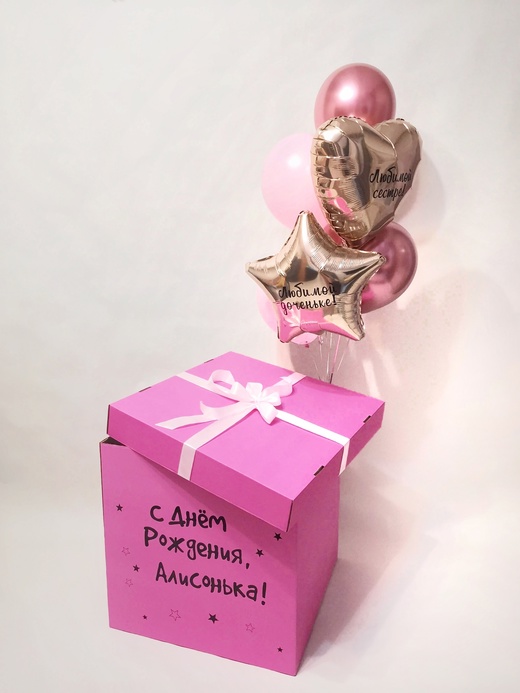 Коробка 60*60см 1штНадпись любая 1штФонтан:Сердце 1штЗвезда 1штНадпись любая 2штХром 2штПастель 2шт