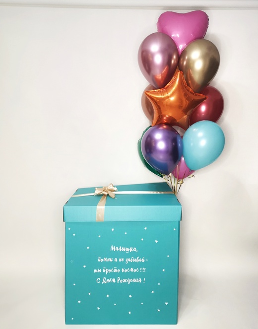 Коробка 1штНадпись любая 1штФонтан из 11 шаров:Звезда 1штСердце 2штХром 5штПастель 3шт