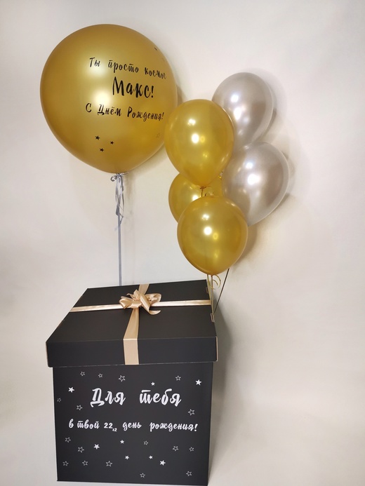 Коробка 60*60см 1штНадпись любая 1штШары в коробку:Перламутр 5штГигант однотонный 1штНадпись любая 1штВ коробку помещается до 7 шаров (в том числе звёзды, сердца)
