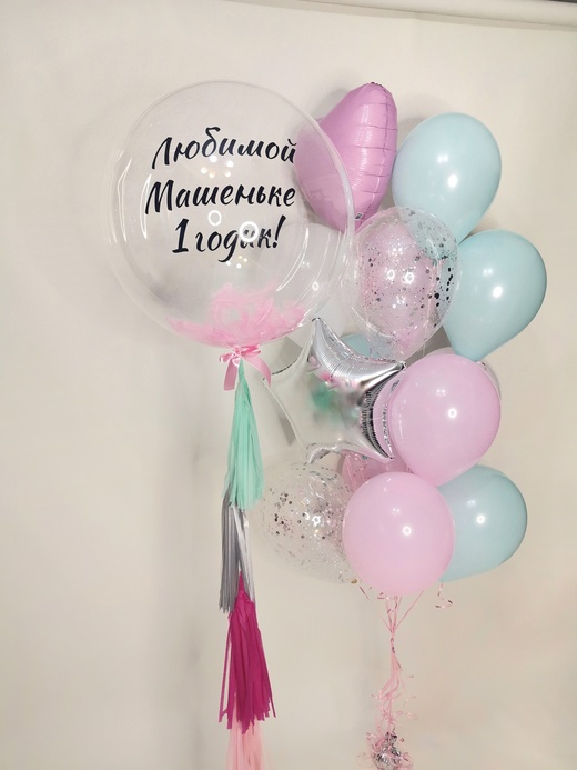 В набор входит:Бабл большой с перьями 1штНадпись любая 1штТассел кисточки 1штФонтан:Сердце 1штЗвезда 1штС конфетти 2штПастель 10шт