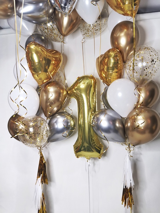Цифра 1штДва фонтана из:Сердце 2штС конфетти 4штПастель 6штХром 10штТассел 2шт.Под потолок:Сердце 2штС конфетти 2штПастель 3штХром 5шт