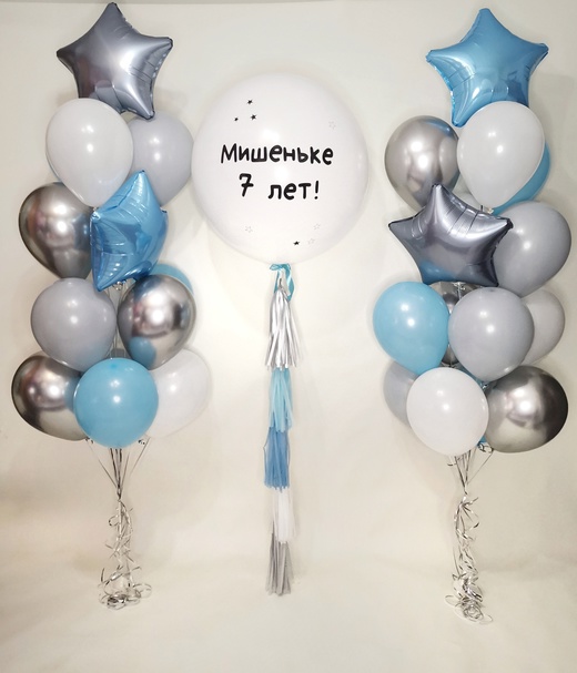 Шар гигант однотонный - 1штНадпись индивидуальная - 1штТассел - 1штДва фонтана из:Звезда - 4штХром - 6штПастель - 20шт